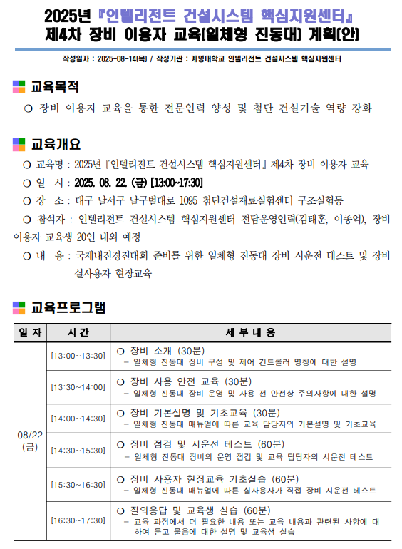 14 8월 2025년 『인텔센터』 제 4차 장비이용자 교육(일체형 진동대) 안내 Posted at 11:11h in 공지사항 by kyintel 0 Comments 교육 문의 : 053-580-8745~7 Share Print page back