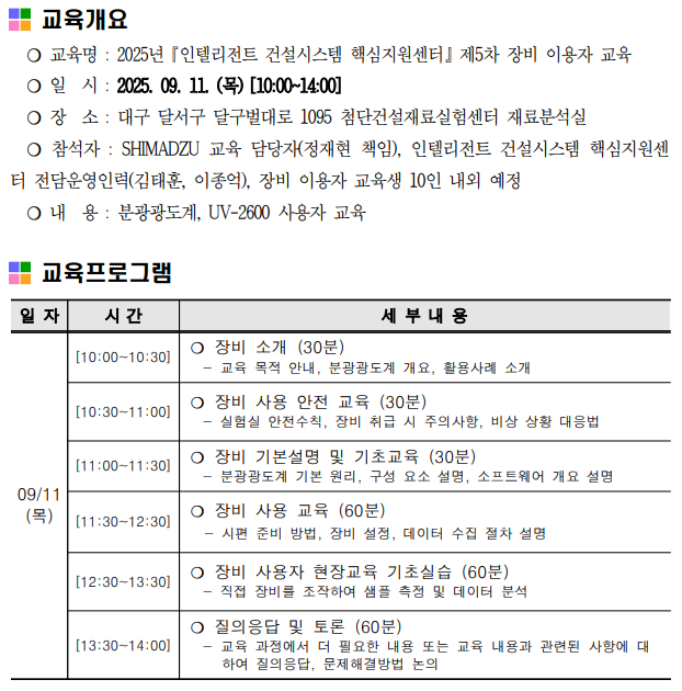 05 9월 2025년 『인텔센터』 제 5차 장비이용자 교육(분광광도계) 안내 Posted at 11:45h in 공지사항 by kyintel 0 Comments 교육 문의 : 053-580-8745~7 Share Print page back